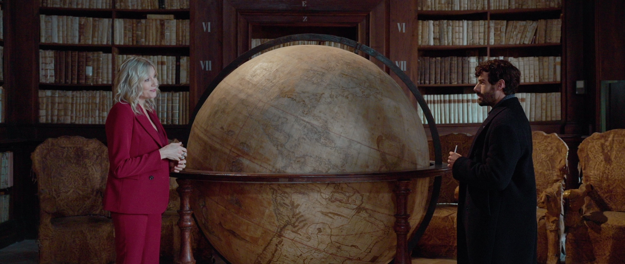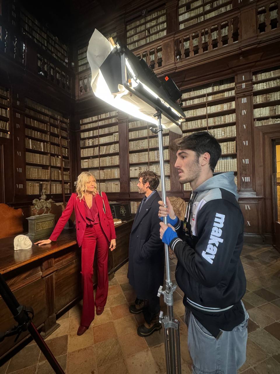 Natasha Stefanenko ed Enrico Oetiker nella Sala del Mappamondo all’interno della Biblioteca Romoldo Spezioli, nel Palazzo dei Priori di Fermo.