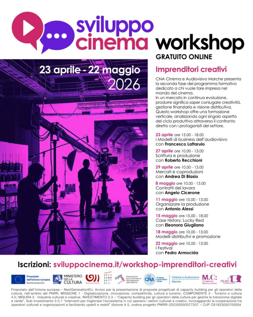 Sono aperte le iscrizioni a “Imprenditori creativi”, il workshop gratuito online promosso da CNA Cinema e Audiovisivo Marche nell’ambito del progetto Sviluppo Cinema, con il supporto di Fondazione Marche Cultura e Marche Film Commission, pensato per giovani professioniste e professionisti del mondo del cinema, ma anche per chi desidera avviare un proprio percorso imprenditoriale nella filiera cinematografica e audiovisiva.