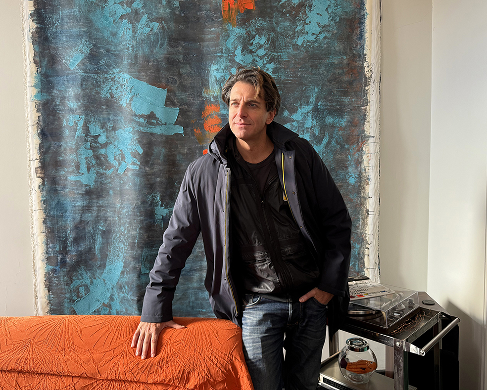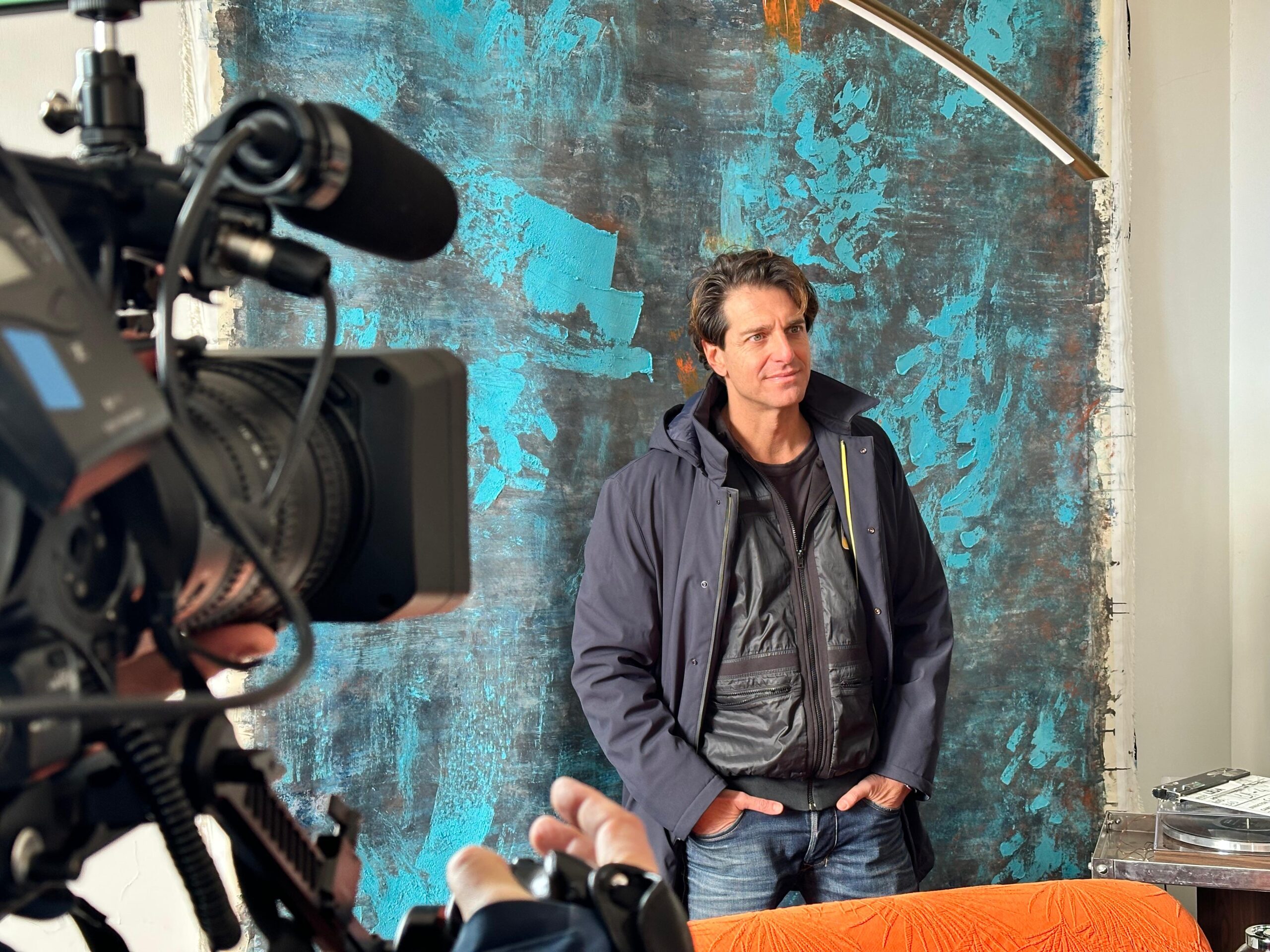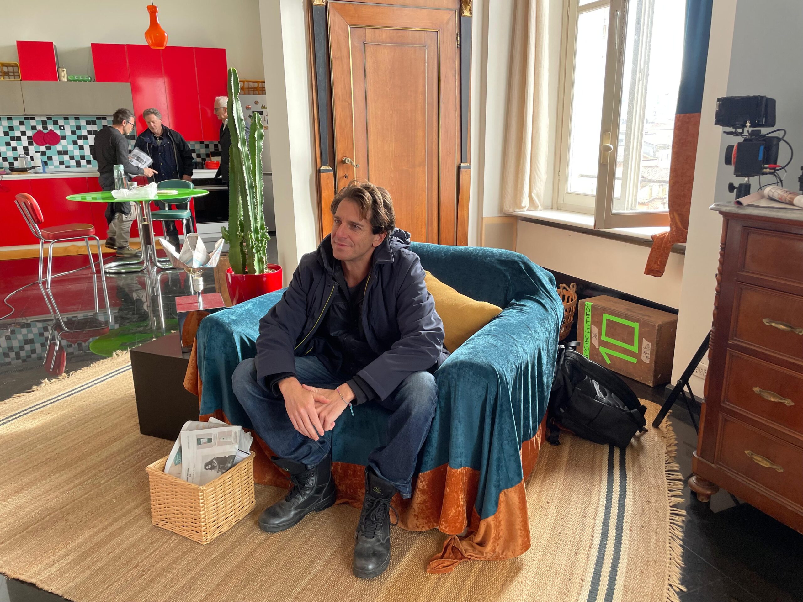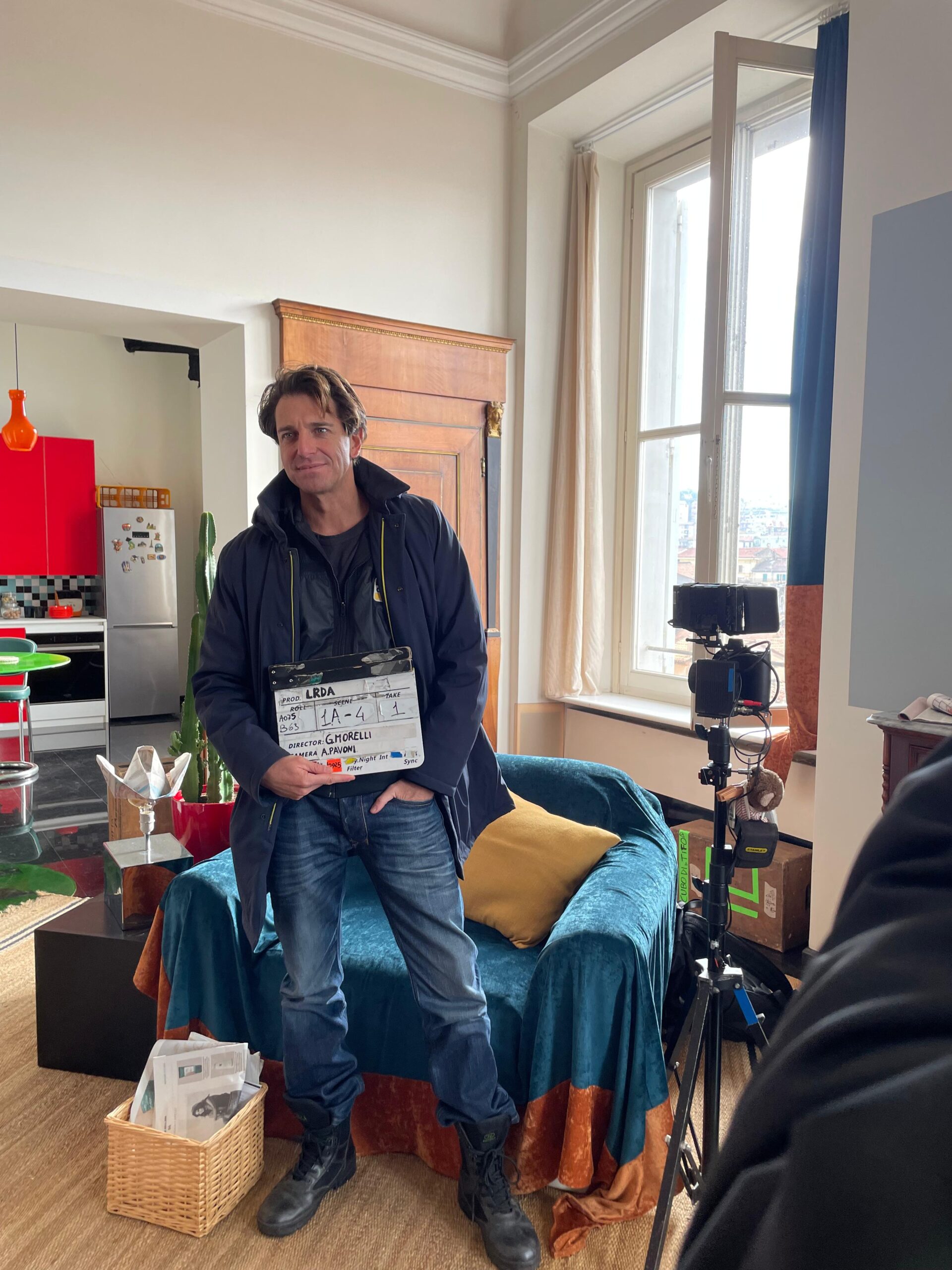 Il regista e attore Giampaolo Morelli sul set di “La regola dell’amico”, interamente girato nelle Marche. Il quadro alla parete è stato realizzato dagli studenti del Liceo Artistico “E. Mannucci” di Ancona.